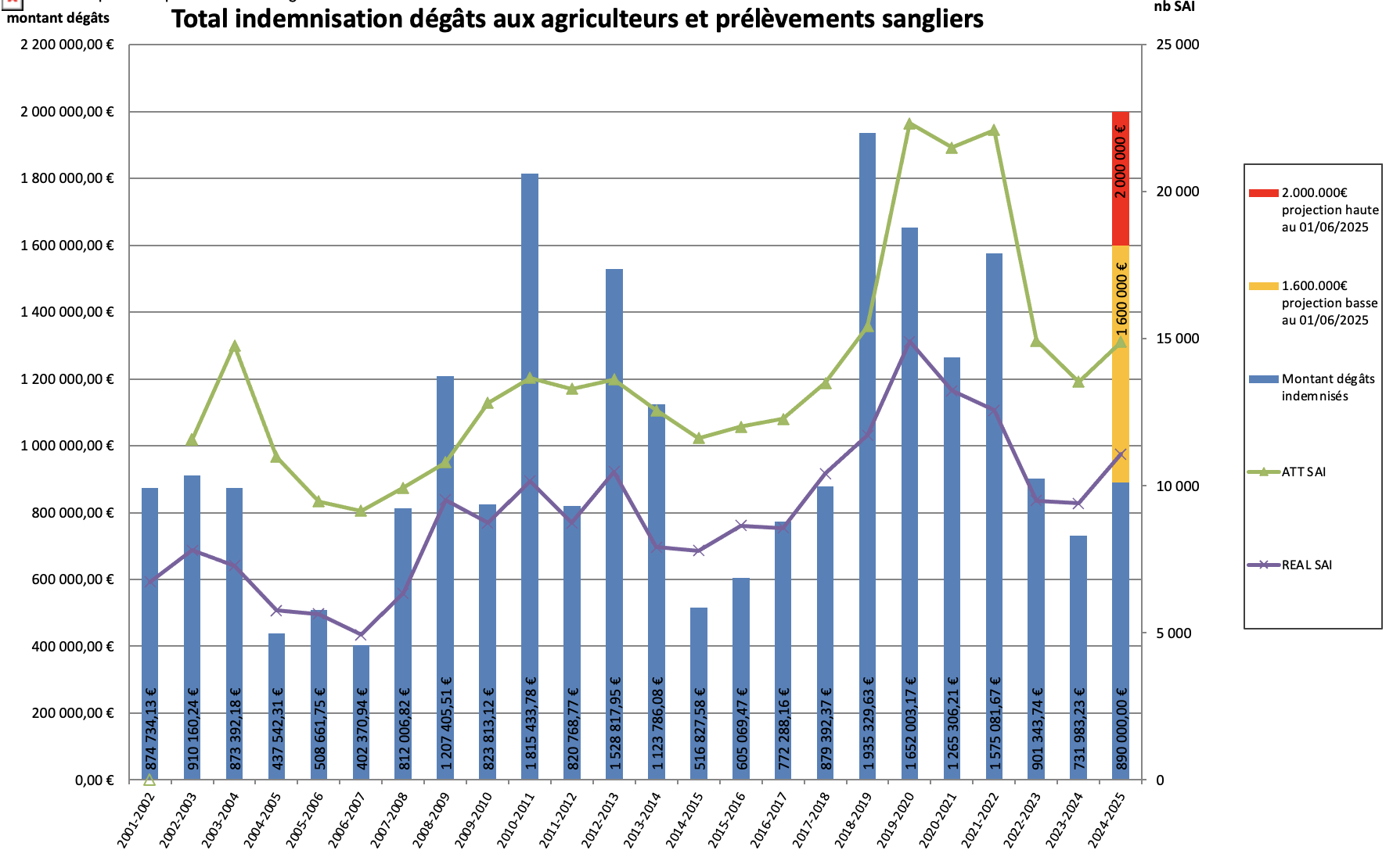 Nous savons donc d’ores et déjà que notre facture dégâts sera beaucoup plus élevée que 2023-2024 et au minimum du double, pour peut-être s’approcher des 2 000 000 €. De plus, l’analyse des surfaces indemnisées montrent une « explosion » de ces dernières par rapport à 2023-2024.