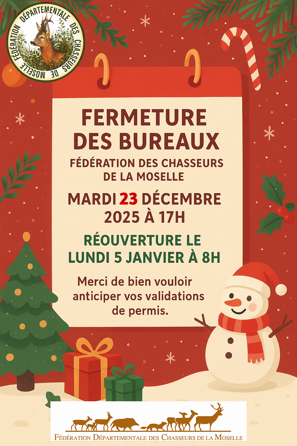 La Fédération des Chasseurs de la Moselle informe ses adhérents que ses bureaux seront exceptionnellement fermés pendant la période des fêtes.