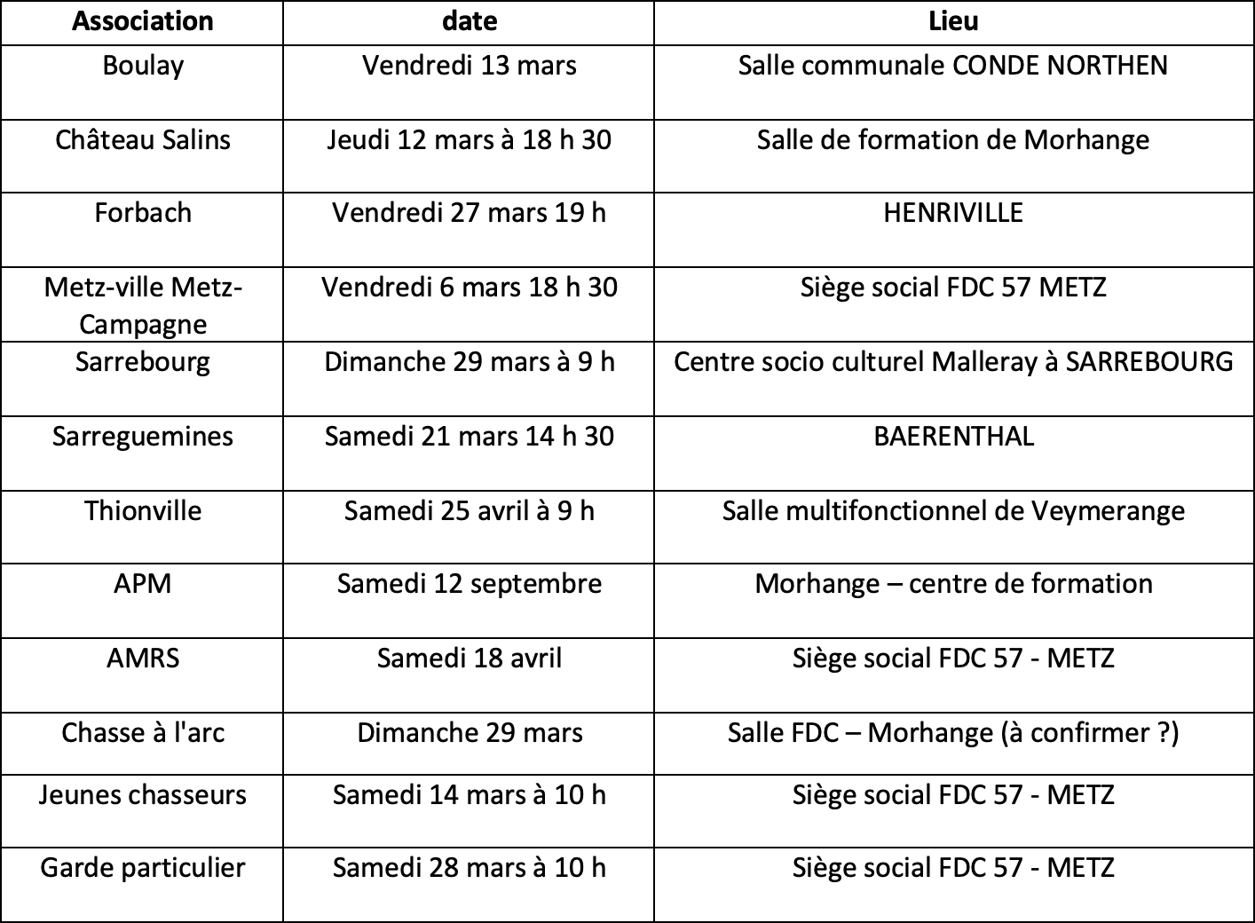 Le calendrier des assemblées générales des associations d'arrondissement et des associations connexes de la FDC57 est arrêté pour le printemps 2026. Voici les dates et lieux à retenir.