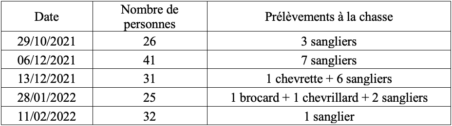 Pour ces 5 journées, vous trouverez dans le tableau ci-dessous le nombre de participants présents et les prélèvements d’animaux effectués :