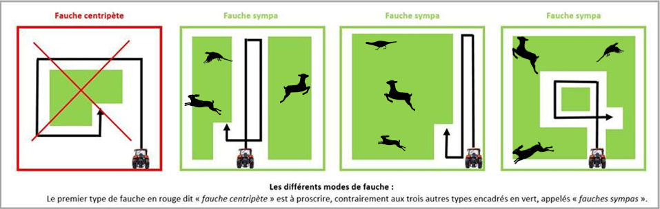 Une autre méthode sans surcoût est fortement conseillée, c’est la fauche centrifuge, aussi appelée « fauche sympa ». Ce procédé consiste à faucher du centre de la parcelle vers les extérieurs de celle-ci. Cette technique permet de pousser les animaux et ainsi les faire fuir de la parcelle. Il ne faut pas oublier que la hauteur de la végétation additionnée à la déstabilisation engendrée par le bruit des machines fait perdre leurs repères aux animaux.