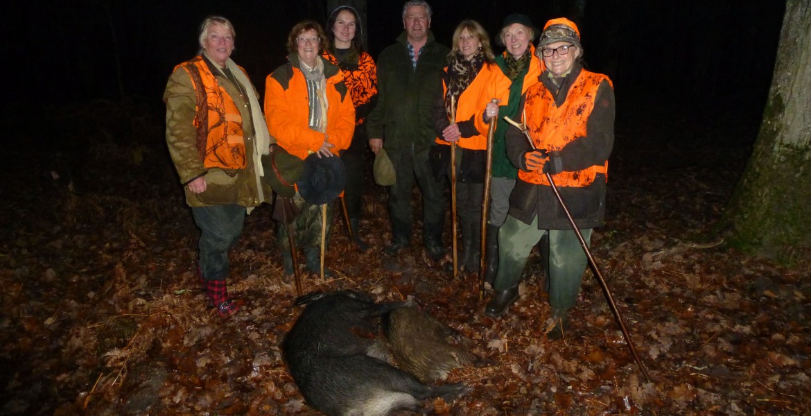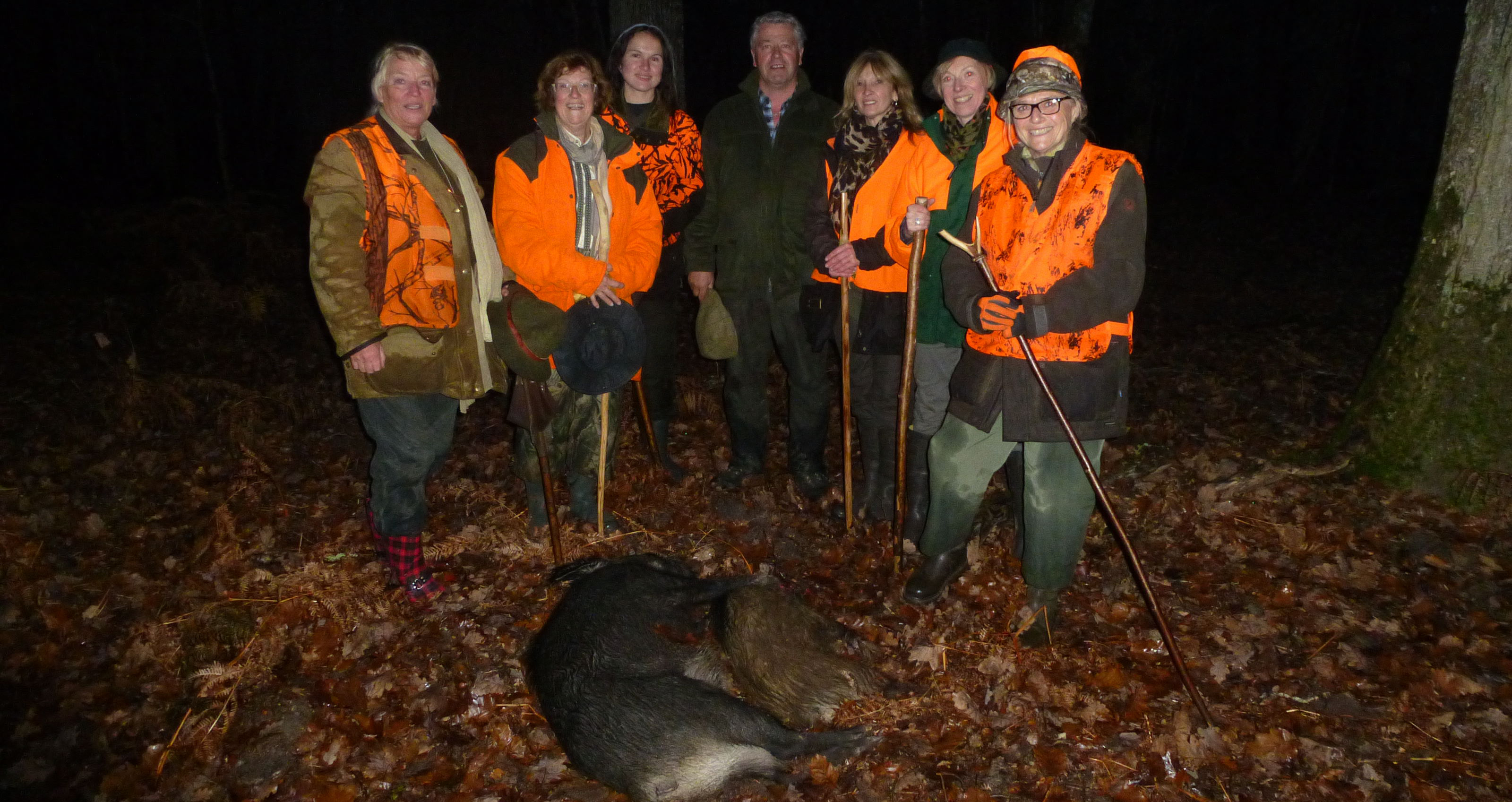 Les gorges ayant été bien humectées, nos voix firent des prodiges dans la forêt et les sangliers terrifiés fusaient de tous côtés. Arrivées aux postés, les cors sonnèrent la fin du rabat et de la chasse. Nous cheminions, fourbues mais contentes lorsque nous fûmes congratulées par un chaleureux chasseur, heureux d’avoir pu réaliser un doublé de sangliers, grâce à nous, disait-il (voir photo).
